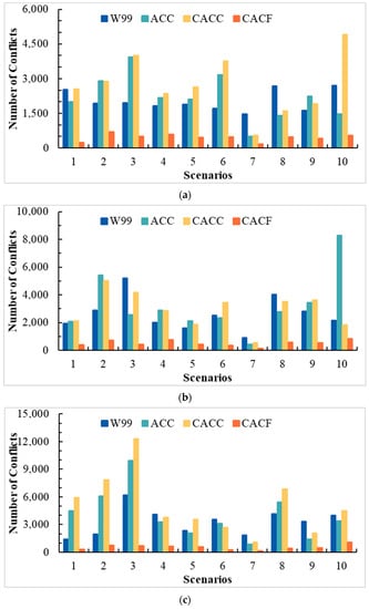 In most cases, the CACC model produced the most conflicts with the same traffic condition followed by the ACC model, because its behavior was highly related to the type of preceding vehicle, was set to be 1.4 s when it was equipped with the ACC model or human drivers, and 0.5 s if it was equipped with the CACC model. It was too short of s to produce conflicts when the penetration rate of AVs with the CACC model was low.