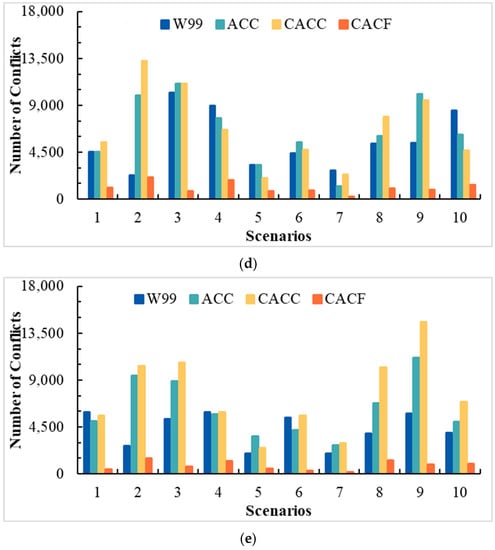 Figure 5a–e compares the simulation results of the average number of conflicts from the four different models with ten different traffic conditions (seed numbers) at speed limits of 24.59 m/s, 26.82 m/s, 29.06 m/s, 31.29 m/s, and 33.53 m/s, respectively. Despite the variations in the performance of these four models, a consistent observation emerges: across a range of traffic conditions and speed limits, the innovative CACF model exhibits notably fewer conflicts compared to the W99, ACC, and CACC models. Particularly noteworthy is the suboptimal performance of the CACC model, prominently observed in scenario 10. This finding highlights the potential for autonomous vehicles to demonstrate diminished performance when operating alongside human drivers, especially with low autonomous vehicle penetration rates.