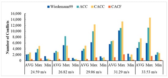 Figure 6 further compares the average, maximum, and minimum number of conflicts of the four models at five speed limits of 24.59 m/s, 26.82 m/s, 29.06 m/s, 31.29 m/s, and 33.53 m/s. In general, the new CACF model significantly reduced all the maximum, minimum, and average number of conflicts when compared with all the other three models at all speed limits. Table 4 compares the percentage of average, maximum, and minimum number of conflicts comparing the CACF model with the other three models at speed limits of 24.59 m/s, 26.82 m/s, 29.06 m/s, 31.29 m/s, and 33.53 m/s, respectively. The percentage reduction in the average, maximum and minimum conflicts for the CACF model varies from 77.69% to 91.97% compared with the W99 model, varies from 67.00% to 93.94% compared with the ACC model, and varies from 69.17% to 93.25% compared with CACC model at speeds from 24.59 m/s to 33.53 m/s. The safety performance of the new CACF model was consistently enhanced at all speed limits compared with the other three models. Furthermore, as the speed limit increases from 24.59 m/s to 33.53 m/s, a discernible upward trend emerges in the percentage reduction across the average, maximum, and minimum numbers of conflicts when comparing the W99, ACC, and CACC models to the developed CACF model.