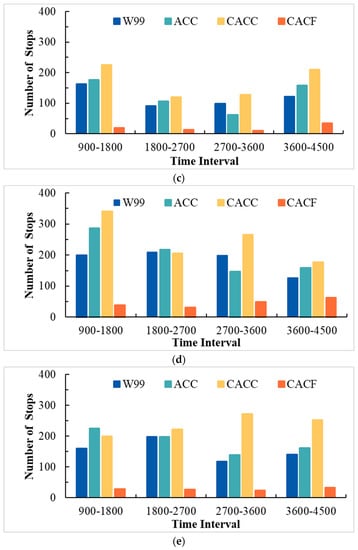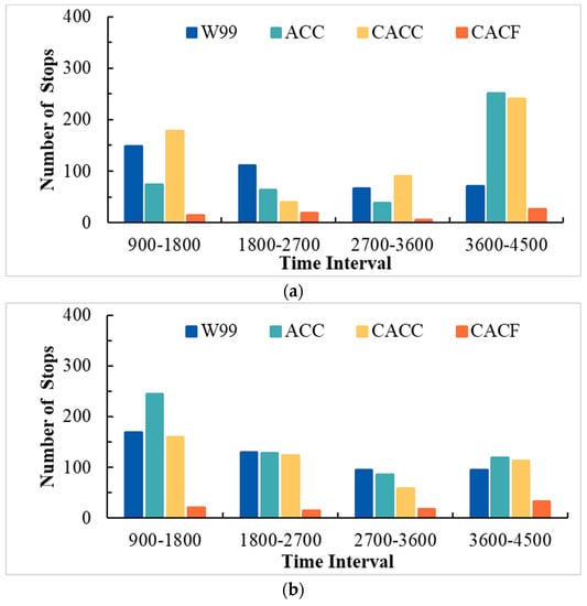The newly developed CACF model can not only reduce the number of conflicts, but also has the potential to improve mobility by reducing the number of stops for vehicles. The highway capacity manual [] recommends the 900-s flow rate as a peak hour factor for most of the capacity analyses. The 900-s interval provides a better statistical representation of traffic output in terms of travel time, delays, queues, and other parameters as compared with the 3600-s time interval. As described in Section 3.1, in this case study, for each simulation run, the simulation length of 4500 s was divided into five travel intervals, with the first 900 s used as warmup and not included in the analysis.
