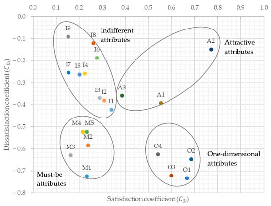 The consumer satisfaction coefficient () and dissatisfaction coefficient () were used to evaluate the degree of customer satisfaction and dissatisfaction with the APL service attributes. The total satisfaction calculation allowed us to present the ranking of attributes according to their classification types in Table 4. As in Xu et al. [72], the matrix presented in Figure 4 illustrates these relationships.
