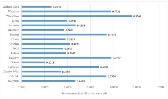 The analysis of the results was carried out taking into account three threads. The first concerns economic aspects. The second covers demographic aspects. As part of the third, the presented results were synthesized in the form of a multi-criteria analysis, which also enabled the hierarchization of the surveyed cities.