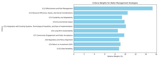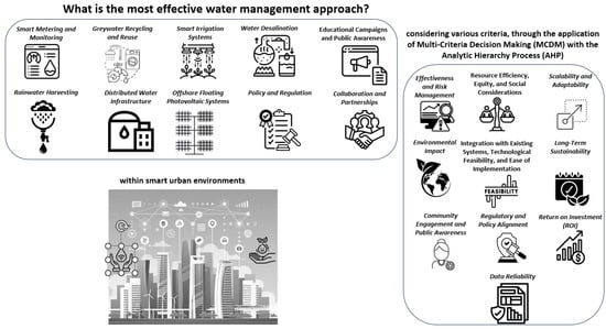 This article addresses this critical gap in the literature by conducting a rigorous and holistic evaluation of ten distinct water management strategies (“Smart Metering and Monitoring, Demand Management, and Behavior Change”, “Rainwater Harvesting”, “Graywater Recycling and Reuse”, “Distributed Water Infrastructure”, “Smart Irrigation Systems”, “Offshore Floating Photovoltaic Systems”, “Water Desalination”, “Policy and Regulation”, “Educational Campaigns and Public Awareness”, and “Collaboration and Partnerships”) within the framework of smart cities. Our evaluation framework encompasses a diverse range of criteria (“Effectiveness and Risk Management”, “Resource Efficiency, Equity, and Social Considerations”, “Scalability and Adaptability”, “Environmental Impact”, “Integration with Existing Systems, Technological Feasibility, and Ease of Implementation”, “Long-Term Sustainability”, “Community Engagement and Public Acceptance”, “Regulatory and Policy Alignment”, “Return on Investment (ROI)”, and “Data Reliability”) that collectively influence the efficacy and feasibility of these strategies. Recognizing the complexity of such evaluations, we employ the Multi-Criteria Decision-Making (MCDM) technique, specifically the Analytic Hierarchy Process (AHP) [,], to assign relative weights to the criteria and rank the strategies accordingly.