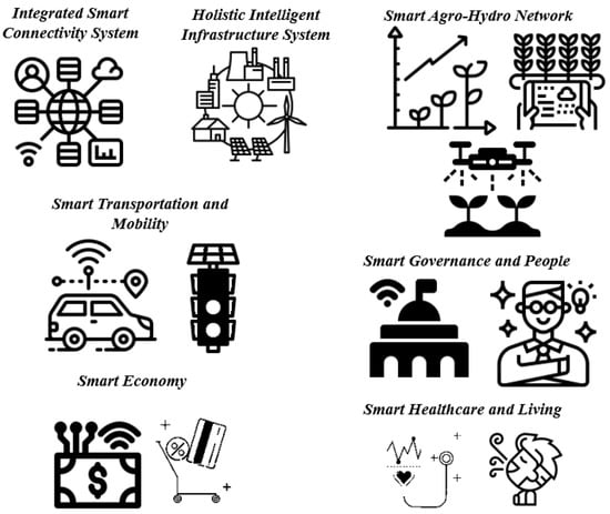 In recent years, the concept of smart cities has gained significant traction as a promising avenue for addressing the challenges of rapid urbanization, resource scarcity, and environmental sustainability. At the heart of this concept lies the integration of cutting-edge technologies, particularly Information and Communication Technology (ICT) and the Internet of Things (IoT), to revolutionize urban infrastructure, governance, and quality of life [,]. This holistic approach touches upon various facets of urban living, from transportation and energy to healthcare and governance [] (Figure 2). Below, we delve into key aspects of smart cities, showcasing their potential and impact.