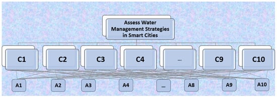 At the highest level of the hierarchy, we have the overarching goal of our study, which is to assess water management strategies in the context of smart cities. This goal serves as the ultimate objective that we aim to achieve through our evaluation.