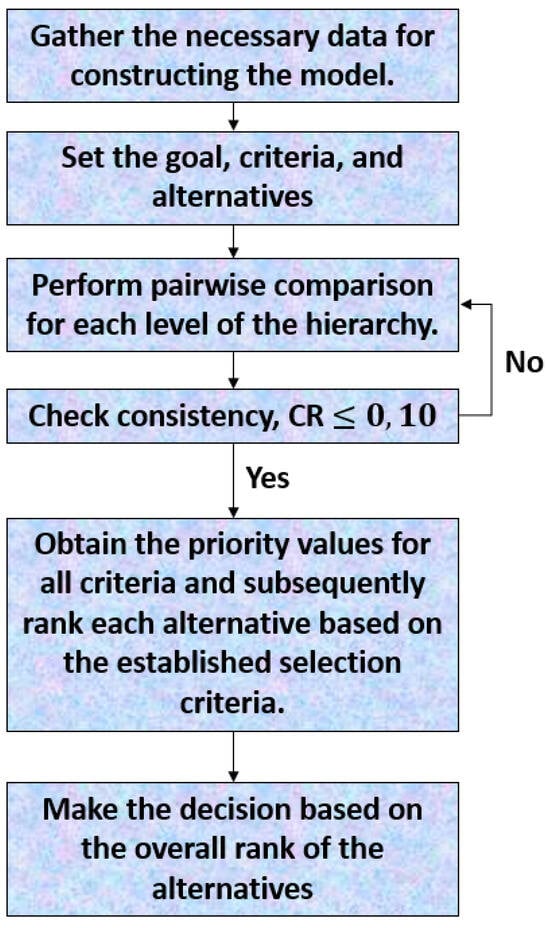 Next, the collected data underwent a pairwise comparison process to derive the importance of criteria relative to one another and the performance of alternatives against each criterion. The Saaty scale (Table 1), a widely accepted method for AHP [,], was used to convert qualitative expert judgments into numerical values. Eigenvalue calculations determined the consistency of expert judgments. If necessary, adjustments were made to ensure the reliability of the decision-making model (Figure 4) (Section 4.1).