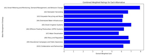 Finally, at the bottom level of the hierarchy, we have identified a range of water management strategies (Section 3.3) as our alternatives for evaluation. These alternatives encompass a broad spectrum of approaches, including Smart Metering and Monitoring, Demand Management, and Behavior Change (A1); Rainwater Harvesting (A2); Graywater Recycling and Reuse (A3); Distributed Water Infrastructure (A4); Smart Irrigation Systems (A5); Offshore Floating Photovoltaic Systems (A6); Water Desalination (A7); Policy and Regulation (A8); Educational Campaigns and Public Awareness (A9); and Collaboration and Partnerships (A10).