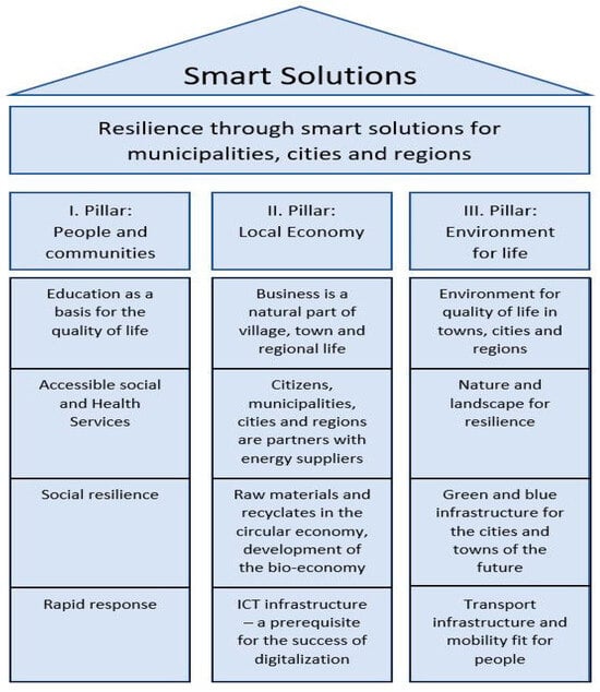 The framework comprises three pillars: people and communities, the local economy and the environment. The first pillar is entitled “People and Communities (Resilient Cities, Communities and Regions)” and comprises four sub-pillars: 1. Education as a foundation for quality of life; 2. Affordable social and health services; 3. Social resilience, 4. Rapid response. The second pillar is entitled “Local Economy (Competitive Cities, Towns and Regions)” and comprises four sub-pillars: 1. Entrepreneurship is a natural part of a municipality, town and region; 2. Citizens and municipalities as partners of energy suppliers; 3. Raw materials and recyclates in the circular economy, development of the bio-economy; 4. ICT infrastructure is a prerequisite for the success of digitalisation. The third pillar is entitled “Environment for Life (Green Cities, Municipalities and Regions)” and comprises four sub-pillars: 1. Environment for quality of life in cities, municipalities and regions; 2. Nature and landscape supporting resilience; 3. Green and blue infrastructure for the cities and municipalities of the future; 4. Infrastructure for transport and human mobility. A graphical representation of these three pillars is shown in Figure 1.