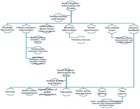 In the south of Moravia is the statutory city of Brno. This city is one of the leading cities in the Czech Republic dealing with the issue of Smart Cities. In Brno, Smart Cities refer to smart urban transport networks, modern water supply and waste management, or more efficient lighting and heating methods for buildings. The modern element of implementing this concept is interactive and more responsive city management, safer public space and meeting the needs of an ageing population [29]. The Commission of the Brno City Council deals with developing and implementing the Smart City concept. The city of Brno does not operate any information system (web presence for Smart Cities). The only available information about Smart Cities is a web presentation called Czech Smart City Cluster [30]. This web presentation contains general information, e.g., memories, methodologies and working groups, but does not provide clear information for citizens, business entities or institutions (municipalities and cities). Another web presentation that can be found in the context of Smart Cities in Brno is the website operated by Brno Communications, which contains information about cleaning the city’s roads or an online system for smart parking called “Domini Park”. After analysing and comparing the current state of the City of Brno and the information systems operated in the form of web presentations within Smart Cities, it can be concluded that almost no information is provided to citizens or private entities.
