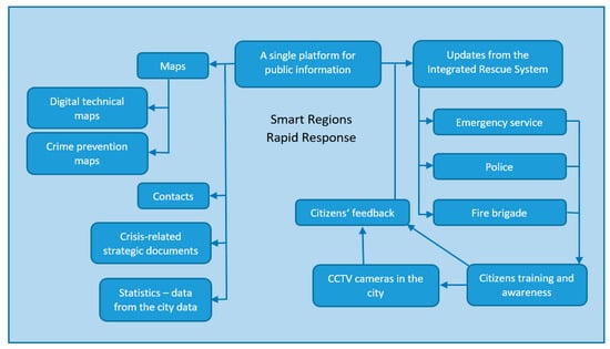 The concept of Smart Cities integrates innovative technologies to improve citizens’ quality of life in towns and cities worldwide. Crisis management is a separate section directly managed by the leadership of municipalities, cities and counties in cooperation between police, fire and municipal police to ensure the safety of residents and safety in public spaces. The purpose of this study is to investigate to which extent publicly available information related to the field of crisis management is unavailable to residents in municipalities, towns and cities through online information systems. The primary aim is to provide suggestions for a general information system structure and content that would highlight and satisfy the need to address the crisis management issue, especially in providing immediate information to the population through an innovative online form. The achievement of this goal is methodologically based on qualitative research analysing and comparing the information published for residents through Smart City information systems in selected towns and municipalities. Document analysis or conceptual design was applied, and evaluation criteria for objective assessment of Smart City information systems were appropriately determined. The comparative analysis based on this set of criteria enabled the development of the proposals of information systems’ content that can be used to keep the information systems for Smart Cities in cities, municipalities and regions, actual and beneficial. From the available resources, two main modules that focused either on citizens or cities were synthesised. Moreover, SWOT analysis or the Smart Regions Rapid Response structure was derived. Acquired results outline generic structures and contents that support the development of the concept of Smart Cities and can be suitably implemented for the development of the modification of information systems containing relevant information for residents, cities and municipalities, focusing on citizen safety.
