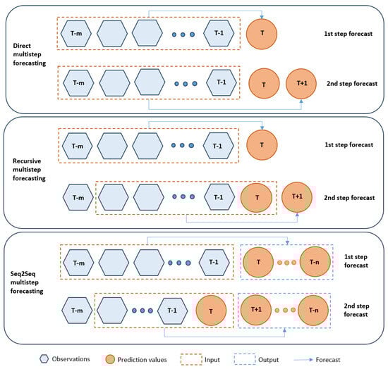 While one-step-ahead forecasting predicts a single future value, the objective of multi-step ahead prediction is to predict a sequence of future values in a time series. Three main strategies are frequently implemented for multi-step forecasting (Figure 1):