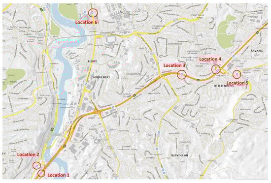 - Traffic flow data: Traffic data were collected from [62]. This web portal provides local hourly traffic flow sensor data for six traffic locations in the city of Trondheim (Figure 2). The time series data include an hourly count of vehicles shorter than 5.6 m (i.e., passenger cars) collected from December 2018 to January 2020.