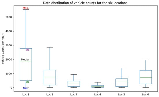 Figure 3 presents a comprehensive summary of the descriptive statistics for traffic data collected hourly across all six locations. Location 1 stands out with the highest mean count, registering approximately 1850 vehicles passing through. A significant volume of vehicles pass through this point, as it is located before a highway bridge, essentially acting as an entry point to Trondheim. The data for Location 1 show the highest variability compared to the other locations (std. deviation of around 1400), indicating temporal reasons due to commute patterns from/to the outskirts of the city. Location 2 exhibits a lower mean vehicle count (around 830), as this location serves as a road leading to the highway. Location 4 is located on a ramp that leads vehicles to and from the same highway, thus also exhibiting lower counts. In general, Locations 3, 4, and 5 are not part of the primary route towards the city center, which may explain the lower overall count of cars.
