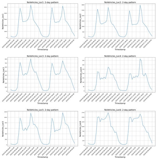 Figure 4 depicts the daily pattern for all locations, which is characterized by a surge in the number of vehicles during the morning rush hour, with a peak typically observed at around 8:00 a.m. This peak corresponds to the typical hours when individuals are heading to work. In the evening, there is another peak at around 4:00 p.m., coinciding with the end of the workday, as people are returning to their residences. That said, it should be acknowledged that there is significant variation in the traffic flow distribution on different days of the week. Especially on weekends and holidays, there is reduced commuting towards the city center, but there can be potential spikes in recreational travel, particularly on highways leading out of the city or to recreational venues (e.g., shopping centers, stadiums, etc.).