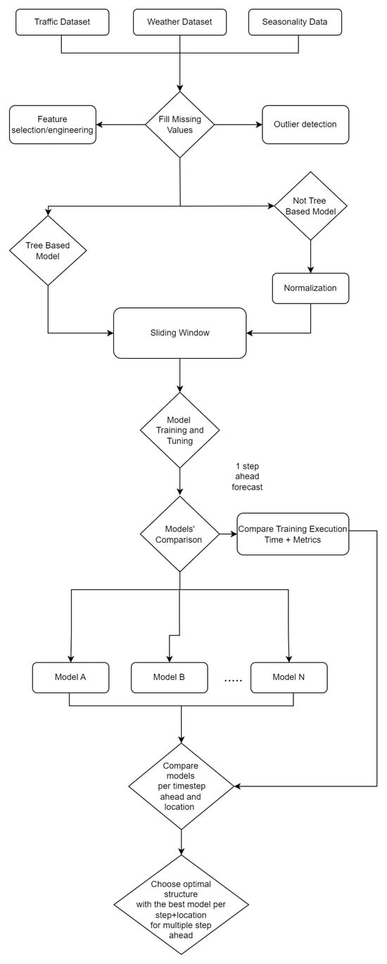 Additionally, alternative approaches, such as statistical and other parametric models, are often implemented to predict traffic congestion. Statistical models typically include ARIMA and its variants [46,47,48]. Other parametric methods such as fuzzy logic models [49,50]), predictive frameworks utilizing Kalman filters [51,52], and Bayesian networks [53]. In the realm of time series forecasting, such methods have been widely utilized due to their mathematical simplicity and versatility in previous years. However, their interpretability and straightforward nature often fall short of capturing the complexities of data patterns, particularly when dealing with nonlinear and long-term dependencies [54,55]. As ML techniques gain prominence, numerous studies and research papers are highlighting the limitations of statistical methods compared to state-of-the-art ML and DL algorithms across a variety of applications [34,56,57] and particularly regarding traffic prediction [58,59]. This has led to a noticeable shift towards such methods and often a hybridization approach of parametric methods and ML/DL algorithms [60,61]. Consequently, we considered experimenting with such methods by testing well-established and efficient algorithms which are currently regarded as state-of-the-art in the field.