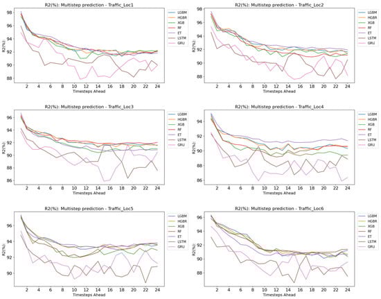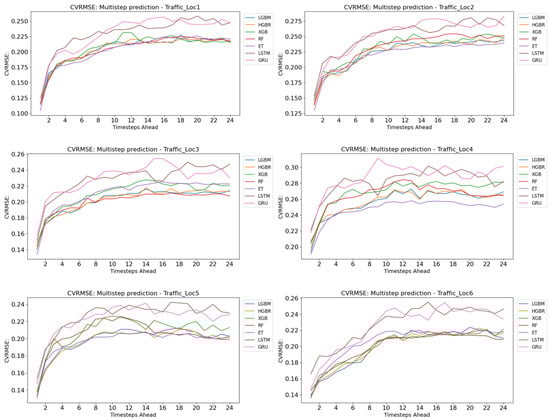The findings of this study suggest that that different models excel at different forecasting steps and selected traffic locations, achieving good accuracy, even in the later steps of a 24 h prediction cycle. Overall, the DL implementations fall behind compared to traditional shallow learning models, such as Decision Tree Ensemble regressors. ET and RF have the best predictive performances in almost all locations, especially for longer forecasting horizons. When assessing the overall performance across these locations, on average, HGBR and LGBM emerge as the most consistently reliable models with low execution times.