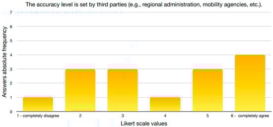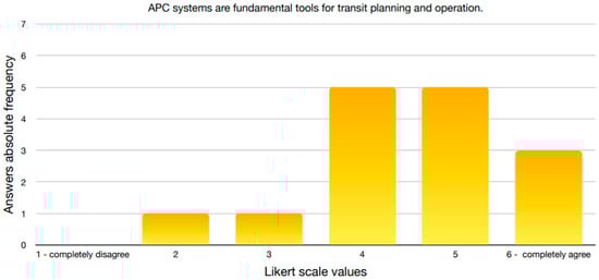 To evaluate the above information, a number of statements were drawn up, which respondents were invited to endorse or reject, with their responses scoring from 1 to 6 on a Likert scale. The survey was administered using the Lime Survey platform, and the link to the questionnaire was sent to selected technicians working for Italian public transport companies, as well as to ANAV (Associazione Nazionale Autotrasporto Viaggiatori) and ASSTRA (Azienda di trasporti, trasporti internazionali merci), two trade bodies linking transport companies that in turn disseminated the link to their members.