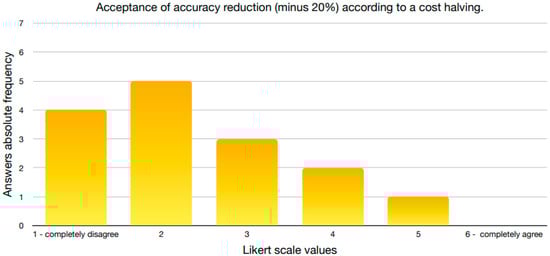 Equation (3) can be used to compute KPI2 in cases where both cost and accuracy are available, expanding the scope of KPI1 to include system performance in addition to the purely financial aspect. The weights (w1 and w2) were derived from the survey responses; the average values corresponding to the levels of importance ascribed to accuracy and cost were normalised using Equation (2), similarly to the weights in KPI1. These values were then used to obtain KPI2. Therefore, there is likely to be a high correlation between the two KPIs if the accuracy of the compared APC systems is similar. Although many companies report similar high accuracy values, ideal scenarios often diverge from the actual accuracy in the field []. This discrepancy, influenced by product-specific factors and different city contexts, can lead to significant differences between KPI2 and KPI1.