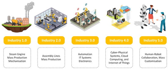 Industry 5.0, also known as the Fifth Industrial Revolution, represents a new phase in the evolution of industrial processes, characterized by a shift towards human–machine collaboration and the integration of advanced technologies across various sectors [3]. Klaus Schwab, the founder and executive president of WEF, introduced the concept of the Fourth Industrial Revolution, also known as Industry 4.0, which focused on automation, digitization, and the implementation of cyber-physical systems to optimize productivity and efficiency [4]. Figure 1 demonstrates the revolution of industry throughout the generations, from the first generation to the fifth generation.