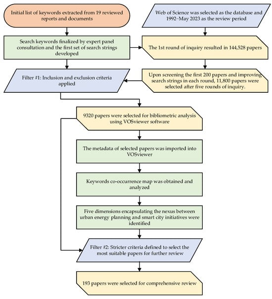 It is worthwhile to note that during the preceding steps, we discovered that there have been remarkable advancements in smart city technologies, policy frameworks, and energy planning methods over the past three decades. The term “Smart City” emerged in the 1990s, bringing forth new possibilities for how modern technology could impact urban areas. Dameri and Cocchia [39] provided a comprehensive account of the origins of this concept, highlighting that its initial conceptualization occurred in 1992 by Gibson et al. [40] through their book titled “The Technopolis Phenomenon: Smart Cities, Fast Systems, Global Networks”. Accordingly, we selected the time period from January 1992 to May 2023 to conduct this bibliometric and scoping review. Examining this period allowed us to gain a deeper comprehension of how urban energy planning practices have evolved and how smart city initiatives have been incorporated into rapidly changing energy landscapes.