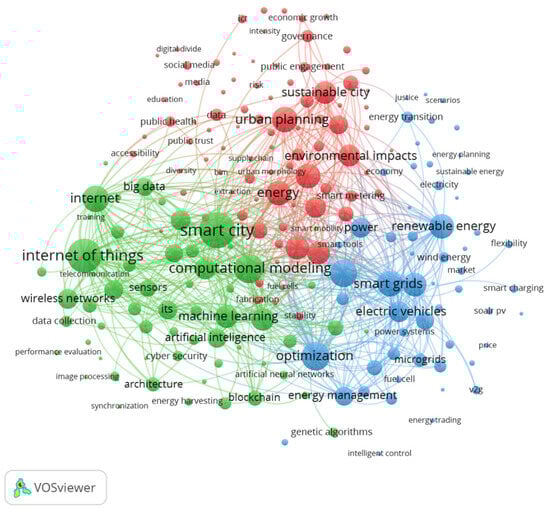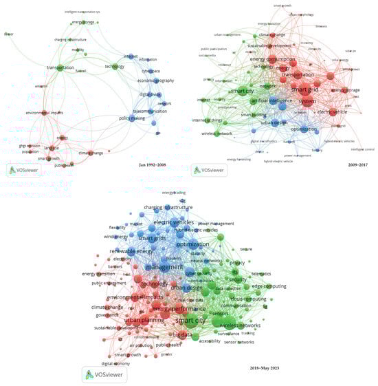 Guided by the VOSviewer co-occurrence maps for each period, as illustrated in Figure 4, our bibliometric analysis emphasizes the progressive evolution of the literature on smart cities and urban energy planning through three transformative periods. The initial period from 1992 to 2008 was formative, merging technology with sustainability and governance, and giving rise to the role of smart transportation within urban energy and environmental planning. Between 2009 and 2017, rapid technological growth was accompanied by the emergence of AI, energy storage, smart grids, and EVs. However, socioeconomic factors were often overlooked. The most recent phase, 2018 to 2023, has sought to redress this by harmonizing technological growth with economic and socio-ecological priorities, influenced by the imperatives of climate change, energy transition, social and environmental justice, the COVID-19 pandemic, and privacy and security concerns and marked by widespread developments in 5G, DT, IoT, blockchain, big data analytics, and machine learning, among others. As Figure 4 shows, despite these advancements, a notable gap persists between the literature focusing on the technical dimensions of smart cities and studies addressing the socioeconomic and environmental implications, indicating the need for a more balanced research approach.