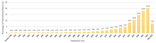 Figure 3 shows that 77.5% of the 9320 scholarly papers were published between 2018 and May 2023. The concentration on research efforts within these years underscores the value of the comprehensive review conducted in the next section. Therefore, when considering the entire time span from January 1992 to May 2023, Figure 2 and Figure 3 highlight both the significant development of the field and several prospects for further exploration.