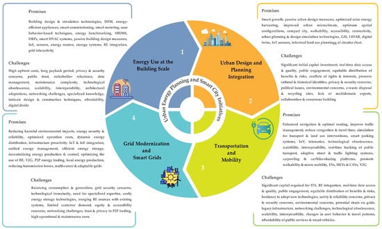 This conducted review showed that the energy performance of the building sector is transforming through the integration of technologies such as AI, DT, IoT, IoE, and RE sources in building design and construction [45,59,60]. These same technologies find application in urban planning and design, forming a synergy with passive measures to enhance energy efficiency. The deployment of IoT devices, remote sensing, GIS, and AI algorithms provides a unified approach, allowing for the optimization of RE harvesting, spatial planning, UHI mitigation, and energy demand prediction [50,82,85,94]. This emphasizes the interconnectedness of buildings and urban design and planning, showcasing the seamless integration of energy efficiency from individual buildings to the urban landscape. In the realm of smart transportation and mobility, technologies such as ITS, IoT-enabled solutions, V2G, and EVs represent a broader application of intelligent systems and technologies [106,123,124,145]. Grid modernization and smart grids mark the convergence of these initiatives. Enhanced with IoT devices and other smart technologies, smart grids increase control, predictive capabilities, and energy efficiency while fostering decentralized systems, energy storage, and RE integration [174,176,184,186,187].
