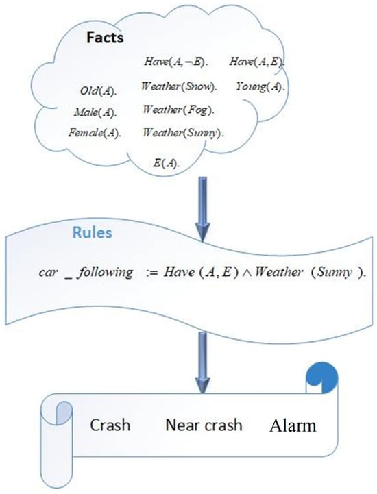 The agent uses logical statements and facts to represent knowledge, which can come from various sources, including data, research, expert knowledge, and previous interactions with the driver, as illustrated in Figure 5. Logical statements are used to express the relationships among different variables or conditions, enabling the agent to make logical deductions based on the information provided. Facts are typically specific data points or pieces of information about the driver, the driver’s current state, the environment, and the vehicle. The agent uses the rules it formulated, the logical statements available, and facts to infer new information. In this context, inference refers to the process of drawing logical conclusions or making predictions based on the rules and the knowledge provided. The agent’s role is to reason and deduce how a driver’s human factors may lead to specific driving behaviors; for instance, it might infer that a tired driver is more likely to exhibit slower reaction times.