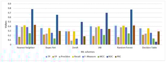 The cost function is a distinctive type of function designed to minimize error and bring the predicted output as close to the expected output as possible. It employs two parameters for error calculation: the estimated output of the CNN model, often referred to as the prediction; and the actual output. Among various machine learning tasks, the mean squared error (MSE) serves as a prevalent loss function, especially in regression problems. Depending on the nature of the specific problem and its requirements, other loss functions like the root mean square error (RMSE) and the mean absolute error (MAE) are also commonly employed. Table 2 compares various machine learning schemes based on statistical measurements of error. The nearest neighbor and random forest algorithms provide better classification performance than others, namely, the zeroR, NBN, and DT. Furthermore, these two schemes outperform the others for accuracy, as can be seen in their higher rating in the comparison graphs in Figure 6. TP stands for true positive, FP (false positive), MCC (Matthews Correlation Coefficient), ROC (Receiver Operating Characteristic) Curve, and PRC (Precision-Recall Curve)