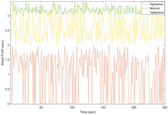 The intricate connection between human factors and driver behavior concerning time headway is multifaceted and shaped by diverse elements. Human factors exert a substantial influence on how drivers perceive, understand, and react to the necessity of maintaining appropriate time headway. Figure 7 shows graphic samples of mean time headway values for aggressive, inattentive, and normal drivers.
