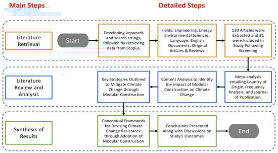 Inclusions: TITLE-ABS-KEY ((“Modular construction” OR “Prefabricated Construction” OR “Offsite Construction” OR “Modular Building”) AND (“Climate” OR “Climate Change”) AND (“Mitigation” OR “Resistance” OR “Resilience” OR “Management”)).