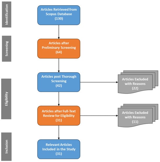 The search string employed without applying filters presented 130 relevant articles initially. For the initial screening of studies, several constraints and filters were applied to the search string as previously listed. We also excluded studies from trade journals and gray literature by limiting the search to academic journals only, given their higher credibility due to rigorous peer review. Sixty-six studies were excluded as they did not meet the specified criteria, leaving 64 filtered articles. Subsequently, the articles underwent a thorough screening based on predefined inclusion and exclusion standards derived from previous studies of relevant nature []. Articles were included if they met the following criteria:
