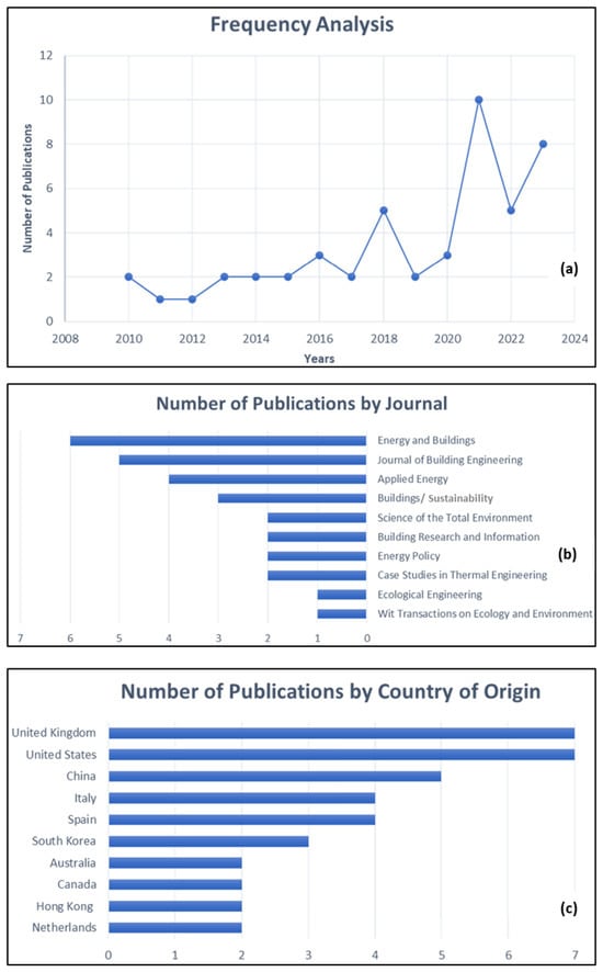 Sources of publications were also analyzed to present the number of scholarly contributions made by different journals to MC and CC. By outlining the contributions of esteemed journals on MC for CC resistance, the source analysis underlines the significance of this research theme within academia and the industry. The results of the publication source analysis are displayed in Figure 3b. The results show that Energy and Buildings has been the most ardent contributor to the research theme, with six articles addressing MC and its impacts on CC. It is closely followed by the Journal of Building Engineering, which boasts five publications in the concerned domain, making it the second major source of literary contributions. Both these journals are indexed as “Q1” by the Scimago Journal & Country Rank (SJR), which substantiates the significance of the research theme and the interest of esteemed journals in addressing this area.
