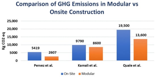 MC creates avenues for reducing GHG emissions from the CI, which is highly beneficial for CC mitigation as these emissions are widely regarded as major contributors to CC. Multiple studies have reported lower emissions for MC than traditional construction methods. MC can induce a 46.9% reduction in GHG emissions when measured against the GHG emissions of on-site construction []. Figure 4 compares the lifecycle GHG emissions of modular and on-site construction. Pervez [] and Quale [] reported a 51% and 30% reduction in MC emissions, respectively, deeming it more sustainable than on-site construction. Kamali [], however, in their study, argued that MC can render a 12% reduction in GHG emissions compared to on-site methods, emphasizing the lower carbon footprint of MC. Other relevant findings suggest that the most significant GHG sources in construction projects include embodied emissions, emissions during the transportation of materials (modules), emissions pertinent to construction processes, and emissions during deconstruction [].
