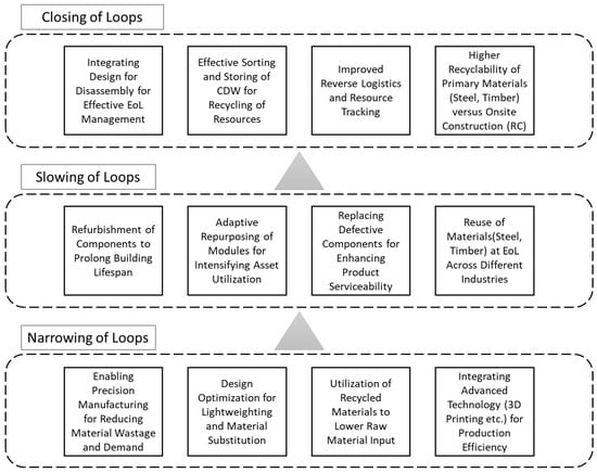 MC facilitates the integration of CE principles in construction by actively supporting three core strategies of a CE: (1) narrowing, (2) slowing, and (3) closing the loops. Narrowing the loop is a CE strategy emphasizing fewer resources per product to alleviate the excessive consumption of resources []. Reducing the use of natural reserves in the production and consumption of resources is a fundamental tenet of narrowing []. MC enables the narrowing of resources by implementing precision manufacturing in construction works. The meticulous fabrication of building components enabled by the factory setting of MC minimizes the generation of construction waste, which in turn lowers the demand for raw materials []. Computer numerical control (CNC) machines, 3D printing, and laser cutting are some technologies that are widely used in MC to cut, shape, and mill the construction materials precisely while strictly adhering to the design guidelines, which prevents the excessive use of resources during the fabrication of building components []. The standardization of modules produced in off-site construction facilitates the implementation of automated manufacturing systems in construction, effectively reducing variances in the final products and the redundant consumption of resources driven by such variances []. The controlled environment available in MC enhances quality control in construction processes, eradicating errors and omissions sustained during the production of modular units. The improved quality control in MC mitigates the need for rework and corrections to rectify errors, thereby fostering an optimized use of resources []. MC also contributes to the narrowing of resources by utilizing recycled materials in construction works, lowering the number of new resources used per product. Modular units usually constitute steel or timber as their primary building block instead of reinforced concrete, as in traditional methods. Steel and timber are recycled conveniently on a larger scale than concrete, with a heterogeneous composition calling for a complex recovery process that inhibits recycling []. As a result, MC allows the procurement of recycled steel and timber in large volumes to substitute raw materials in construction to narrow the flow of natural resources in CI [].