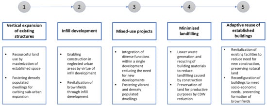Switching from conventional reinforced concrete to prefabricated modules is projected to bring in a 78% reduction in material consumption. Depending upon the level of prefabrication, MC instigates 20–65% waste minimization through the backflow of resources []. Approximately 80% of prefabricated modules can be recycled or reused, underscoring the importance of MC in facilitating CE practices in the CI [].