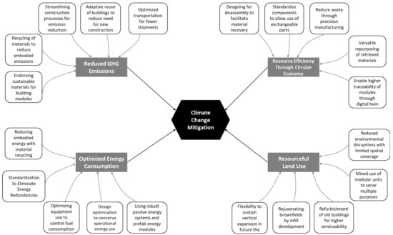 High GHG emissions attributed to the CI are a key contributor to CC []. Curbing the GHG emissions from the built environment remains pivotal in effective CC mitigation []. MC paves avenues for CC mitigation by reducing GHG emissions compared to traditional and on-site methods of construction []. The controlled environment, factory setting, sustainable materials, and optimized equipment use are the key factors governing the lower GHG emissions of MC, which is instrumental to CC mitigation []. Recycling materials and resources in MC is another aspect of reducing embodied emissions in construction as it reduces raw material input []. Thus, in light of the existing literature, it can be concluded that MC offers a valuable opportunity for mitigating CC caused by the CI owing to its lower GHG emissions.