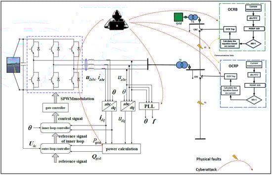 The power system configuration of grid-connected inverter and OCRs with existing physical faults and cyber threats.