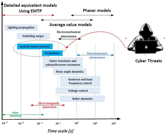 In real power systems and smart grids, the transient phenomena issues are non-steady-state events that can happen for a number of reasons, such as switching processes or faults. In this work, the Electromagnetic Transients Program (EMTP) is used to examine the power network performance under cyber attack. The EMTP enables it to be simple to fully understand how electrical systems react to short-term events, as shown in Figure 1. The EMTP is a commonly used method for obtaining transient solutions in the fields of power systems and power electronics []. This simulation includes all possible electrical conditions and express network equations using differential equations. In the EMPT, the reactance characteristics of capacitive and inductive elements demonstrate changes that rely on the frequency. This requires the development of comprehensive models for electrical components and controllers [,]. By utilizing time intervals of less than 50 microseconds, the EMTP model succeeds at illustrating the sudden dynamics occurring within the power system caused by power electronic equipment such as voltage source converters. In the model power network and smart grids with a DER, the converters are commonly utilized as connectors between the DER and distribution grids. The EMTP simulation plays an increasingly important role in investigating the integration of renewables into modern power networks. This consists of activities such as control system design, investigation of stability, and coordination of protective mechanisms. In addition, the time scale of operation of power protection relays and PV inverters is considered in the area of electromagnetic transient phenomena, as shown in Figure 2. Therefore, it is important to investigate the impact of different cyber threats in the real power system and smart grids within transient phenomena statutes.