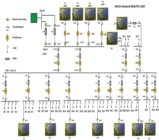 The power grid used in this study mimics a real power grid. This grid is simulated using the EMTP tool, as illustrated in Figure 3. The network includes a mix of conventional electricity sources, signified by a local power company line (Bus 10 (33 KV)), and a PV farm with a total capacity of 4 MWp and links to the 33 KV bus via four power transformers (T15 to T18). This farm comprises four distinct zones denoted as P1 to P4 with a capacity of 1 MWp for each one, as illustrated in Figure 3. In addition, the grid-connected PV system (G1 to G9) to the low-voltage side of the power network significantly contributes to meeting the energy needs of the network, as described in Table 2. As shown in Figure 3, the power network is protected using 12 OCRS. Two primary 33/11 KV transformers (T13 and T14), as depicted in Figure 3, provide power to the LV network. Subsequently, 12 distribution transformers (T1 to T12: 11/0.415 KV) distribute the necessary power to the 37 buildings, denoted as B1 to B37. The expansive LV power network encompasses an area of roughly 34,475 km2, including 37 buildings and supporting an annual energy consumption of nearly 8.5 GWh, as described in Table 3.