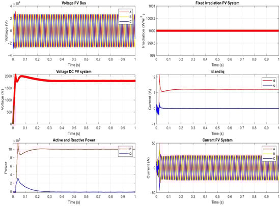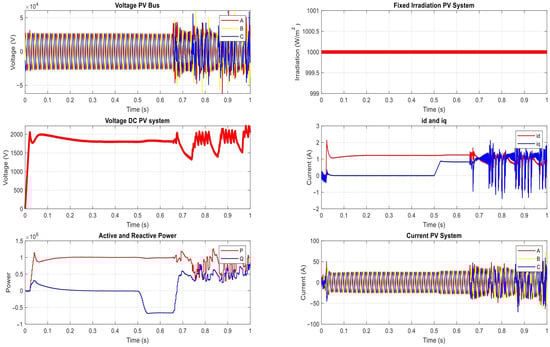 In this investigation, the operational performance of the PV system is evaluated under normal operating conditions, with constant load or irradiation and the exclusion of any attacks or faults. The irradiation level is maintained at a constant 1000 W/, and the simulation duration is set to 1 s to cover the transient events the scope of this work, as shown in Figure 4. The results during the time of less than 0.04 s present the performance during the transient period of connecting the PV to the power grid. During the steady state, the findings indicate a stable power system with the voltage at the Point of Common Coupling (PCC) bus registering at 33 kV. The current within the PV system is measured at 25 A, facilitating an active power output of 1 MW. It is essential to note that the analysis focuses on a single PV unit. Additionally, the direct current component () remains constant at 1.25 A, while both reactive power and quadrature current () values are maintained at zero. This comprehensive examination underlines the robustness and stability of the PV system under optimal operating conditions, providing essential insights into its performance metrics.