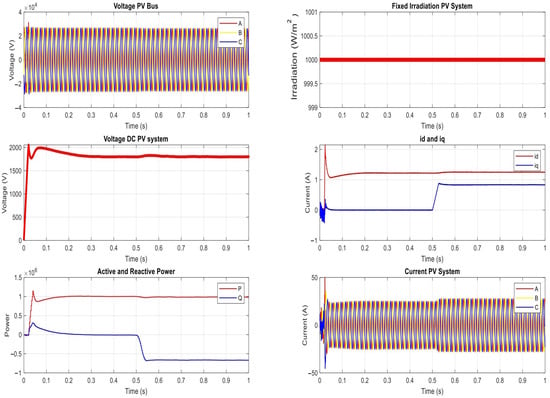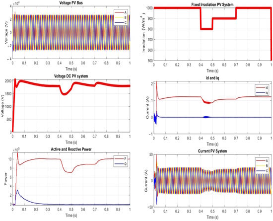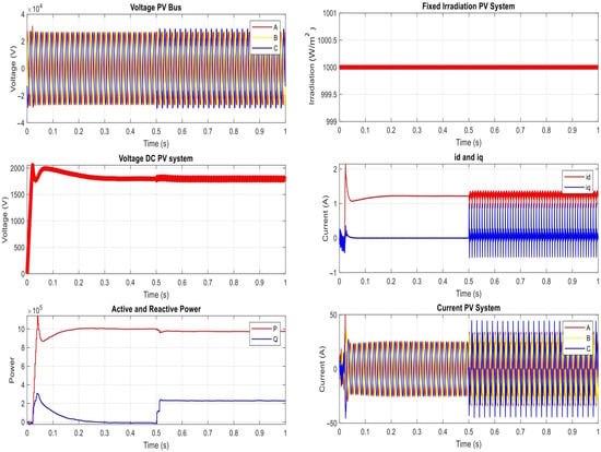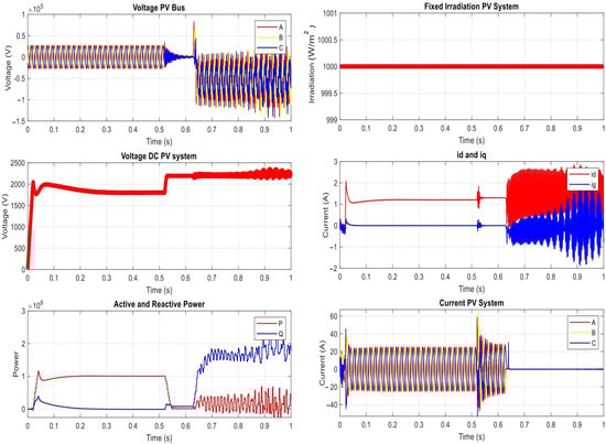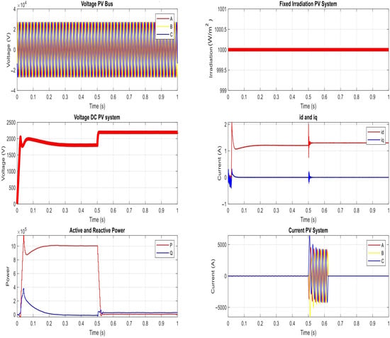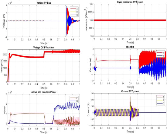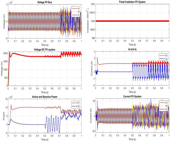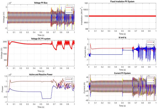 To evaluate the modeling of the proposed power network, the study examines the consequences of a reduction in irradiation levels on the operation of the PV system during normal operation scenarios. Therefore, at time 0.4 s, the irradiation level experienced a temporary decrease from the standard 1000 to 800 W/ for a duration of 0.1 s, and then the irradiation increased to 900 W/ for a duration of 0.2 s, as shown in Figure 5. The level of irradiation returned to its baseline value of 1000 W/ throughout the remaining duration of the simulation. This resulted in a notable decrease in the DC voltage to 1500 V during the interval from time 0.4 to 0.5 s (with 800 W/). The current within the PV system is measured at 17 A, facilitating an active power output of 0.7 MW. While the reactive power maintained a constant value of zero, fluctuations were evident in the active power. Subsequently, as the irradiation level increased to 900, the power ascended to 0.9 MW before returning to its initial level of 1 MW when the irradiation resumed its standard value of 1000. The observed power variations had a noticeable effect on the present values, which were impacted by the consistent voltage at the PCC. This comprehensive analysis offers significant insights into the dynamic behavior of Photovoltaic (PV) systems according to changes in irradiation levels, and how these changes affect power and current dynamics.