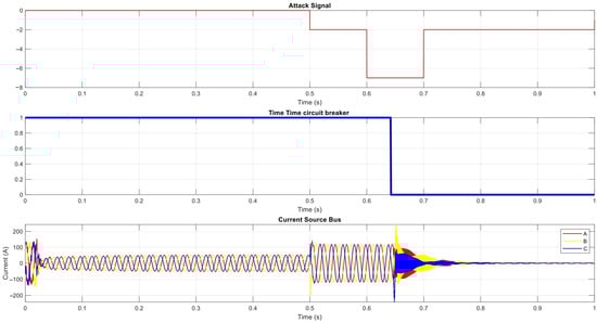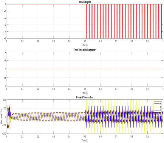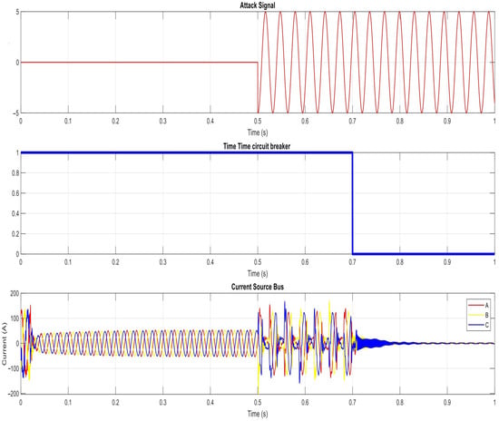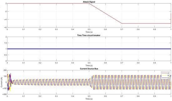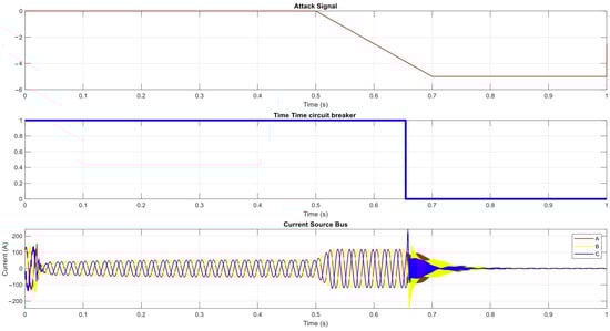 The technique used by the attacker involves affecting the functionality of the Photovoltaic (PV) inverter in terms of its ability to effectively control reactive power. In this particular situation, the control signal responsible for regulating the injection of reactive power into the grid displays a scaling signal waveform, as seen in Figure 11. The signal duration is significantly increased compared to pulse signal control, consisting of 1 pulse within a time range of 0.1 s. This phenomenon results in a subsequent rise in the current at the source bus. Here, the OCR was able to detect the fault and react on tripping the fault at the PV farm side at 0.65 s, as shown in Figure 11. During the initial phase of the attack (0.5 to 0.6 s), there was an increase in the current of the PV system, the system maintained overall stability. However, during the second phase of the attack when the reactive power signal dropped to −7, significant effects on the current were raised, as shown in Figure 11 and Figure 12. The DC voltage of the PV system suffered from significant drops and fluctuations, with values dropping to 1400 V, as shown in Figure 12. These drops were accompanied by a sharp increase in the current at the source bus. As a result, the protection system disconnected the connection to the utility, leaving the system reliant only on the PV, ultimately rendering the system unstable.