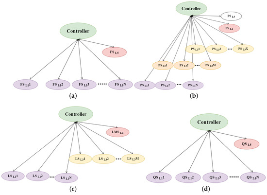 The water from the reservoirs is collected at the sub-reservoirs after treatment. Water is distributed from the sub-reservoirs through the junctions to the consumer points. Even though there is a proper hierarchical plan for efficient distribution, some areas need more water for basic needs due to water leakage, illegal connections, water theft, etc. The supply-consumption imbalance can be identified by placing flow sensors at each level. The flow sensors are to be placed at level 1 and level 5 of the water distribution network. The placement of flow monitoring sensors at each level with a controller is shown in Figure 2a.