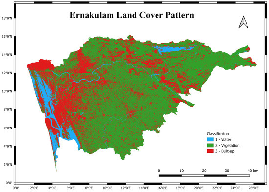 The land cover of the study area was identified and analyzed in QGIS with the open-source plugin Semi-Automatic Classification (SCP) [25]. It enables supervised land cover classification of remote sensing images by downloading free image files from satellites such as LANDSAT and Sentinel and performing prepossessing and post-processing functionalities. Multi-spectral images are processed to produce the land cover classification. SCP was performed on the images downloaded from LANDSAT for January 2021. Tonal and textural variations due to altitude-dependent vegetation and contour information are used for classification. The image was processed to classify the different features on the ground, such as built-up, vegetation, and water. For supervised classification using the maximum likelihood supervised classification (MLC) algorithm, training sets were selected in the LANDSAT imagery with seven bands based on the collected sample points for respective LULC classes. Training sites for LULC classification were selected based on knowledge developed through extensive ground surveys and detailed field studies of the area. Figure 4 shows the LULC classification of the study area.