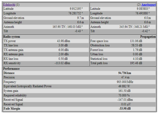 The study area belongs to this category. Hence, the Hata-Okumura model suits for this application.The selected propagation path-loss model for the area is simulated in the web application Radio Mobile Freeware by VE2DBE [34] for the Edakochi study area. The simulator provided a propagation model for the area considering the transmission, channel, and communication parameters, including losses and the land cover model for the area. Figure 5 shows the link between the transmitter and receiver.