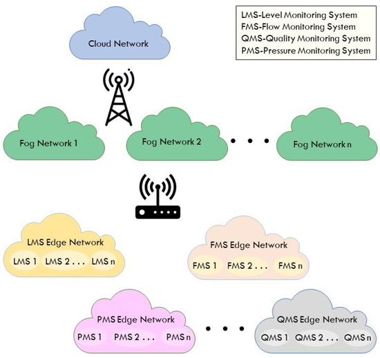 Even though IoT-based systems have the above capabilities, they also have significant challenges, some of which are as follows. IoT systems deal with enormous amounts of data in M2M and device-to-device communications [8]. The timely management of both edge, fog, and cloud nodes without delay in communications can be challenging as network resources are subject to various constraints [9,10,11]. Ensuring the interoperability of APIs and web services, including the mini, micro, and macro communication management of edge, fog, and cloud nodes, respectively, is a challenging task. Security concerns, such as confidentiality/privacy, integrity, authenticity, non-repudiation, and authorization [12,13] have to be achieved in the network for secure communications. Network reliability is one of the critical requirements for IoT deployment with moderate-to-high-priority data. Hence, heterogeneity in terms of data, design, and operation has to be ensured [14]. Low latency and high accuracy are requirements in IoT-based water distribution systems for smart cities [15,16].
