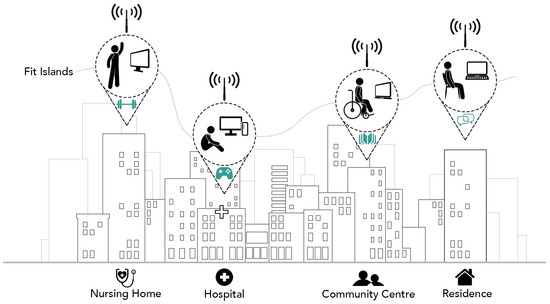 The aim of this study is therefore to try to incorporate Exergame’s game format in the design of a virtual community that encourages physical activity, breaks down spatial isolation in urban areas, crosses the digital gap for older adults, and reduces the impact of uncontrollable events on the city in emerging economies. By proposing a design methodology for the health-promoting Exergame system, new solution ideas are proposed to help different emerging economies cope with the problem of population aging. An Exergame system called Fit Islands has been developed using China as an example. To adapt to different scenarios in the city and meet the needs of more Chinese older adults, the system integrates sports, social, educational and entertainment functions and is universal, affordable, adaptable, and age-friendly. Fit Islands provides a platform for older adults who are in nursing homes, hospitals, community centers and residences, and even older adults in senior colleges and in employee lounges at companies, creating a virtual urban community to link them together (see Figure 1). Functional testing of Fit Islands has confirmed the positive effects of the health-promoting Exergame system in addressing the issue of aging in China, and provides guidance for other emerging economies.