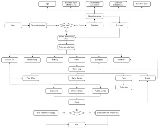 The process of Fit Islands will fully consider the needs of older adults and strive to simplify the game as much as possible. The specific process can be summarized as follows: Initial game installation—Game instructions—Account creation—Main interface—Game map—Gameplay—Points and health knowledge (see Figure 4).