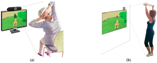 Two game modes: (a) upper body movement; (b) full body standing movement.
